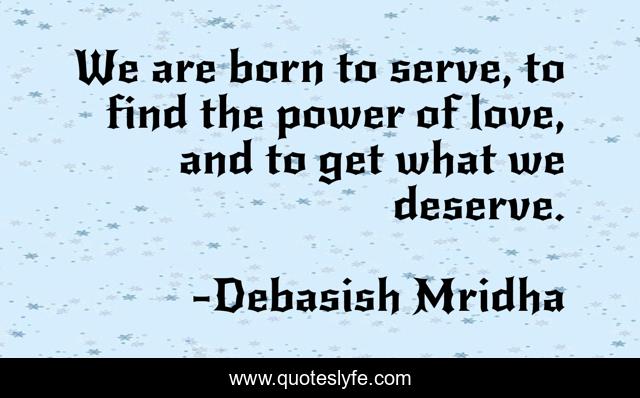 This page presents the quote "We are born to serve, to find the power of love, and to get what we deserve.". Author of this quote is Debasish Mridha. This quote is about love, debasish-mridha, power-of-love, debasish-mridha-m-d, born-to-serve, get-what-we-deserve, affection,.
