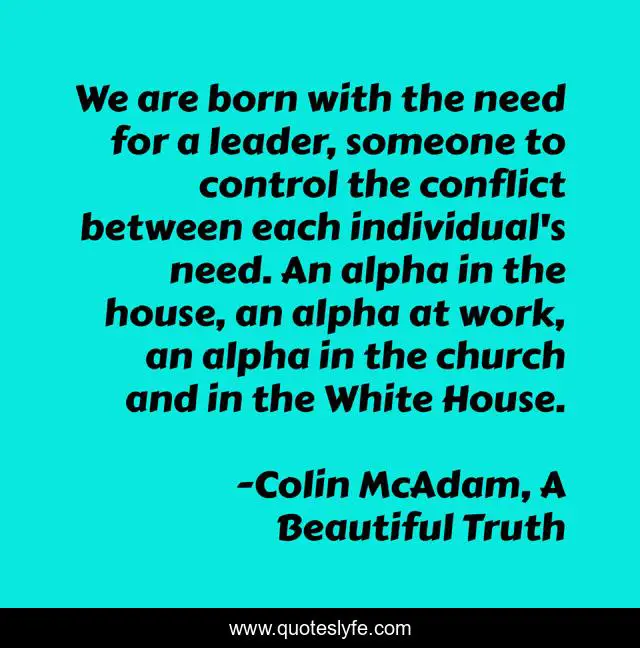 This page presents the quote "We are born with the need for a leader, someone to control the conflict between each individual's need. An alpha in the house, an alpha at work, an alpha in the church and in the White House.". Author of this quote is Colin McAdam, A Beautiful Truth. This quote is about control, leadership, alpha-males,.