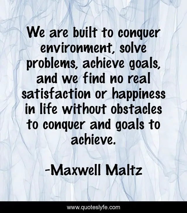 This page presents the quote "We are built to conquer environment, solve problems, achieve goals, and we find no real satisfaction or happiness in life without obstacles to conquer and goals to achieve.". Author of this quote is Maxwell Maltz. This quote is about life, obstacles, goals,.