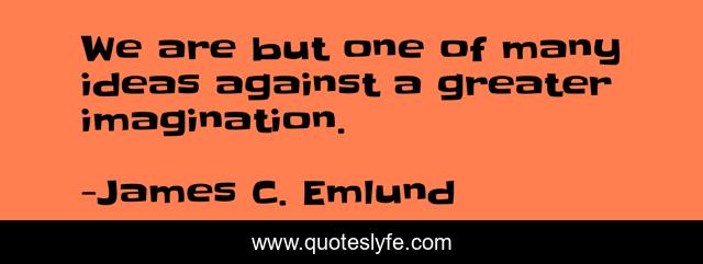 This page presents the quote "We are but one of many ideas against a greater imagination.". Author of this quote is James C. Emlund. This quote is about life, life-lessons, paradigm-shift, ideas, imagination, values-in-life, inspirational, enthusiasm,.