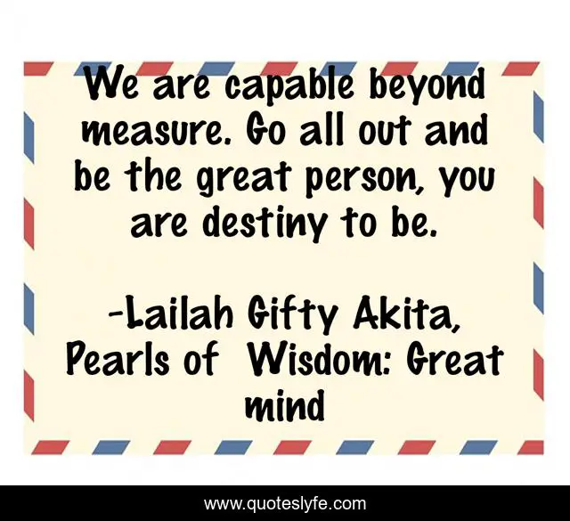"Lailah Gifty Akita, Pearls of Wisdom: Great mind Quotes." Quoteslyfe.com, 2025. Sun. 14 Dec. 2025. <https://www.quoteslyfe.com/quote/We-are-capable-beyond-measure-Go-all-84211>.
