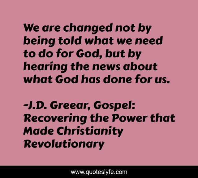 This page presents the quote "We are changed not by being told what we need to do for God, but by hearing the news about what God has done for us.". Author of this quote is J.D. Greear, Gospel: Recovering the Power that Made Christianity Revolutionary. This quote is about gospel, christianity,.