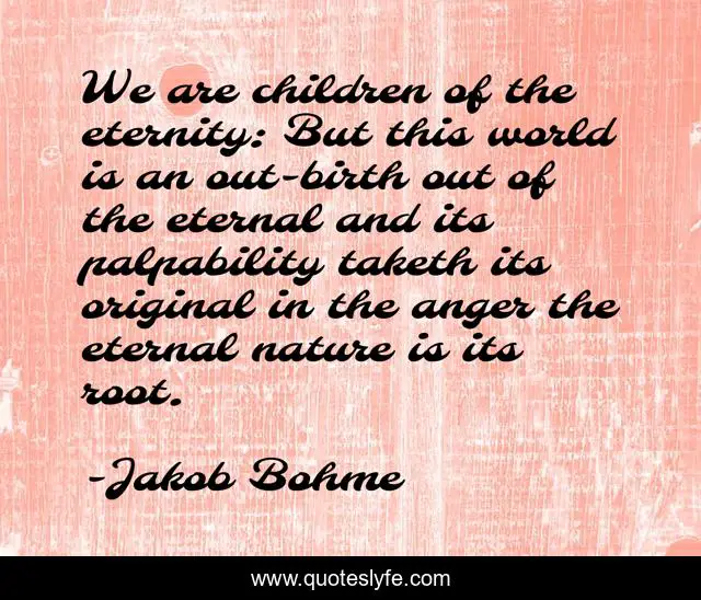This page presents the quote "We are children of the eternity: But this world is an out-birth out of the eternal and its palpability taketh its original in the anger the eternal nature is its root.". Author of this quote is Jakob Bohme. This quote is about world, children, nature,.