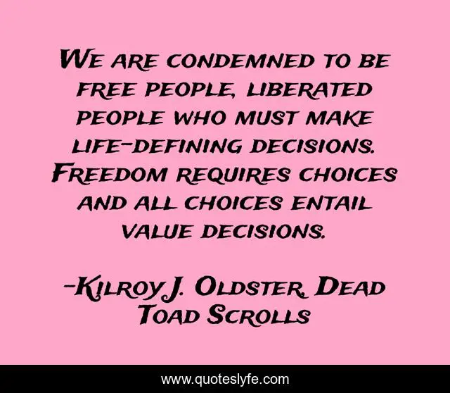 This page presents the quote "We are condemned to be free people, liberated people who must make life-defining decisions. Freedom requires choices and all choices entail value decisions.". Author of this quote is Kilroy J. Oldster, Dead Toad Scrolls. This quote is about self-determination, freedom, decisions-and-actions, value, choices, choice-and-consequences, values, choice,.