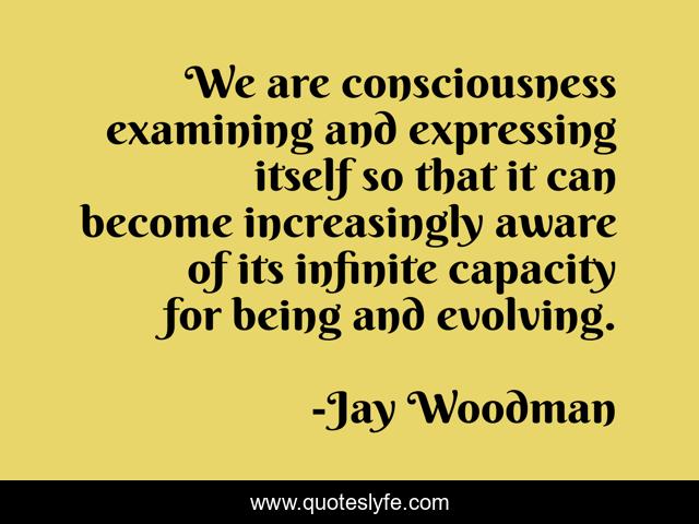 This page presents the quote "We are consciousness examining and expressing itself so that it can become increasingly aware of its infinite capacity for being and evolving.". Author of this quote is Jay Woodman. This quote is about being, evolving, consciousness, expressing, aware,.