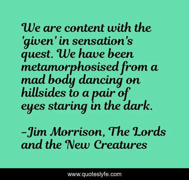 This page presents the quote "We are content with the 'given' in sensation's quest. We have been metamorphosised from a mad body dancing on hillsides to a pair of eyes staring in the dark.". Author of this quote is Jim Morrison, The Lords and the New Creatures. .