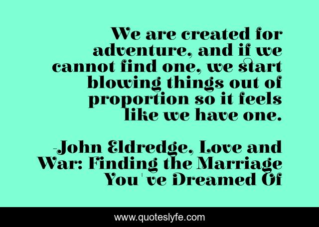 This page presents the quote "We are created for adventure, and if we cannot find one, we start blowing things out of proportion so it feels like we have one.". Author of this quote is John Eldredge, Love and War: Finding the Marriage You've Dreamed Of. This quote is about drama, anxiety, depression,.