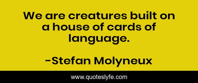 This page presents the quote "We are creatures built on a house of cards of language.". Author of this quote is Stefan Molyneux. This quote is about child-abuse, psychology, psycholinguistics, neurolinguistics, philosophy, abuse, trauma, humanity,.