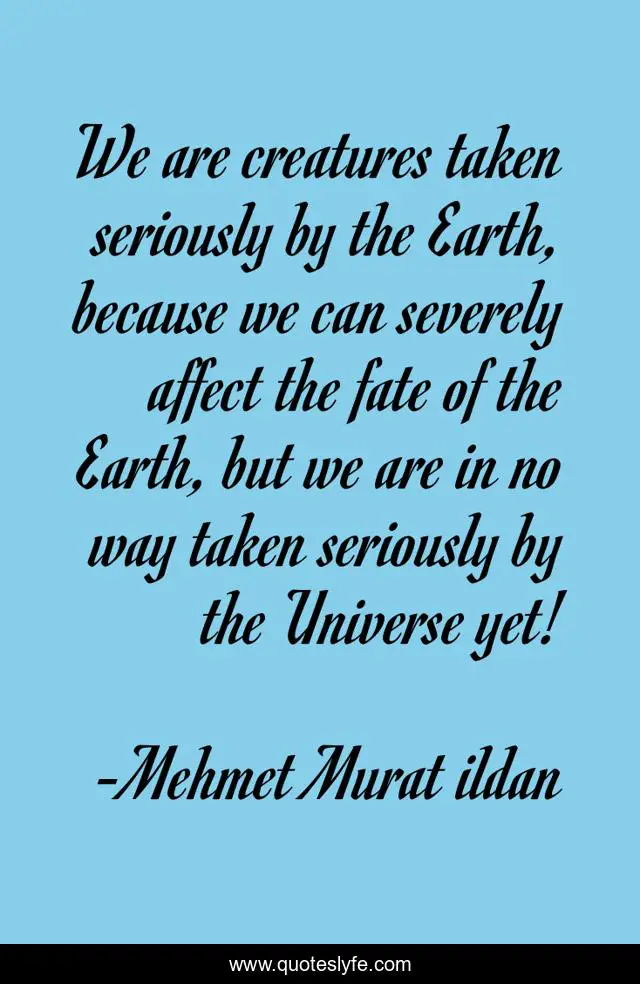 This page presents the quote "We are creatures taken seriously by the Earth, because we can severely affect the fate of the Earth, but we are in no way taken seriously by the Universe yet!". Author of this quote is Mehmet Murat ildan. This quote is about fate-of-the-earth, ildan-wise-sayings, fate, turkish, ildan-wisdom, universe, turkish-playwrights, effect, turkish-wisdom-words,.