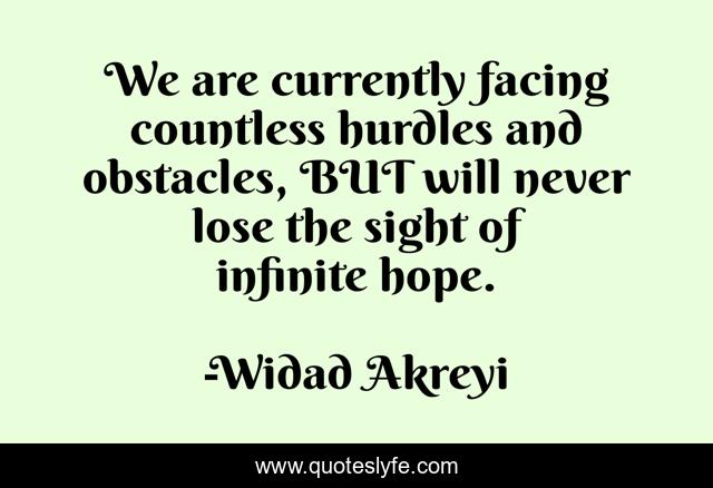 This page presents the quote "We are currently facing countless hurdles and obstacles, BUT will never lose the sight of infinite hope.". Author of this quote is Widad Akreyi. This quote is about hurdles, violence, inspirational, motivational, human-rights, violence-against-women, peace, confidence, widad-akrawi,.