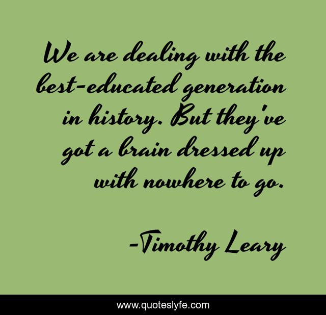 This page presents the quote "We are dealing with the best-educated generation in history. But they've got a brain dressed up with nowhere to go.". Author of this quote is Timothy Leary. This quote is about generation, brain, history,.