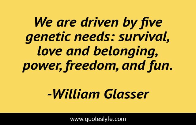 This page presents the quote "We are driven by five genetic needs: survival, love and belonging, power, freedom, and fun.". Author of this quote is William Glasser. This quote is about fun, freedom, love, affection,.