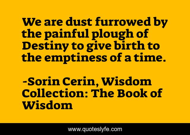 This page presents the quote "We are dust furrowed by the painful plough of Destiny to give birth to the emptiness of a time.". Author of this quote is Sorin Cerin, Wisdom Collection: The Book of Wisdom. .