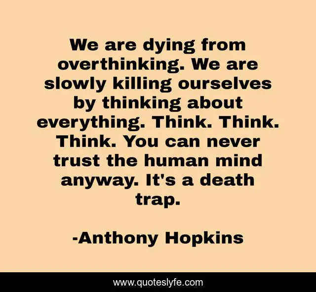 This page presents the quote "We are dying from overthinking. We are slowly killing ourselves by thinking about everything. Think. Think. Think. You can never trust the human mind anyway. It's a death trap.". Author of this quote is Anthony Hopkins. This quote is about thinking, trust, mind,.