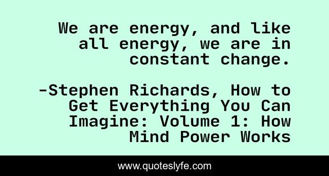 This page presents the quote "We are energy, and like all energy, we are in constant change.". Author of this quote is Stephen Richards, How to Get Everything You Can Imagine: Volume 1: How Mind Power Works. This quote is about law-of-attraction, wishing, law-of-belief, wishes-fulfilled, mind-power, stephen-richards-self-help,.