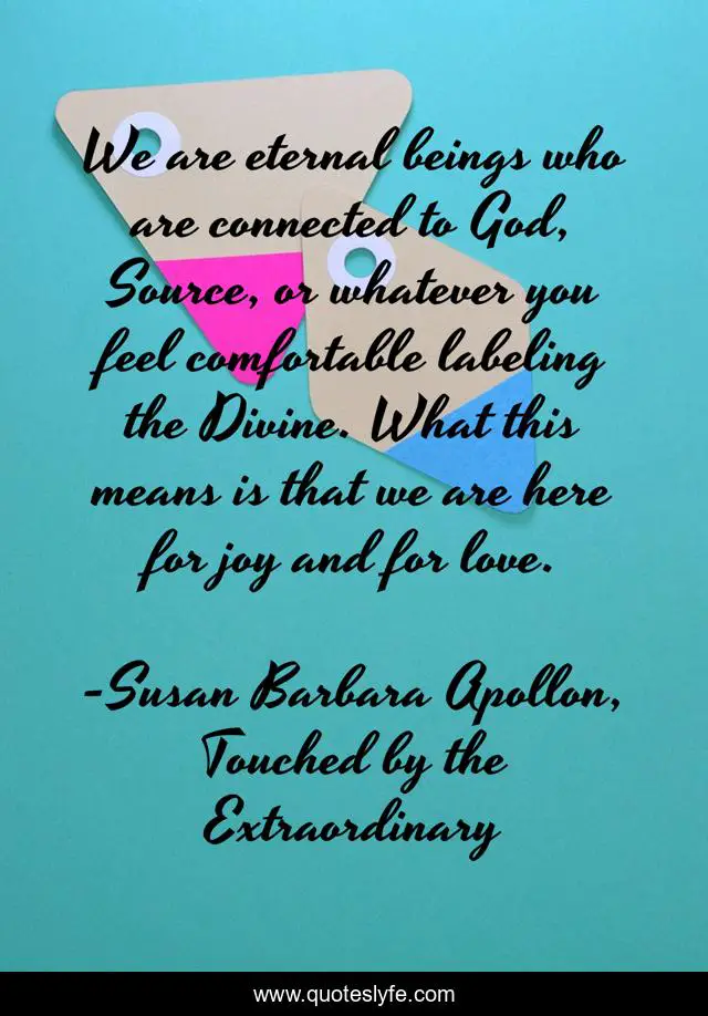 This page presents the quote "We are eternal beings who are connected to God, Source, or whatever you feel comfortable labeling the Divine. What this means is that we are here for joy and for love.". Author of this quote is Susan Barbara Apollon, Touched by the Extraordinary. This quote is about intuition, healing-insights, synchronicity,.