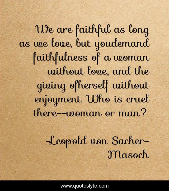 This page presents the quote "We are faithful as long as we love, but youdemand faithfulness of a woman without love, and the giving ofherself without enjoyment. Who is cruel there--woman or man?". Author of this quote is Leopold von Sacher-Masoch. This quote is about woman, love, hurt, cruel, pain, venus, affection, man,.