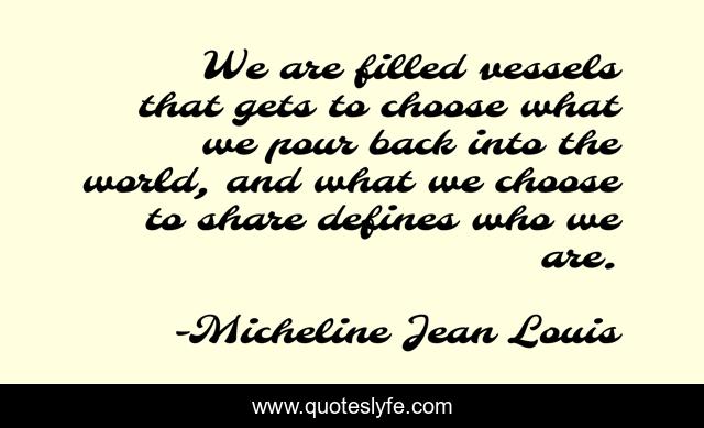 This page presents the quote "We are filled vessels that gets to choose what we pour back into the world, and what we choose to share defines who we are.". Author of this quote is Micheline Jean Louis. This quote is about life, life-lessons, giving, positive, decision, motivational, confidence, choices, meditations,.