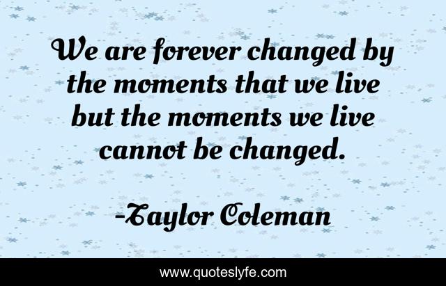 This page presents the quote "We are forever changed by the moments that we live but the moments we live cannot be changed.". Author of this quote is Taylor Coleman. This quote is about enthusiasm, life, thought-provoking, inspirational,.