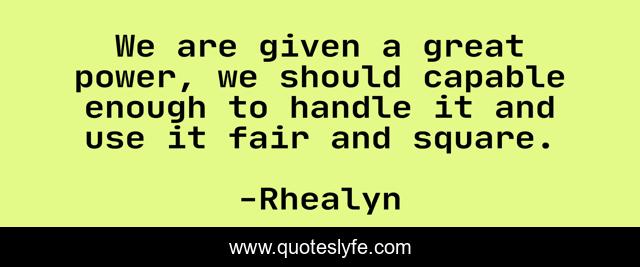 This page presents the quote "We are given a great power, we should capable enough to handle it and use it fair and square.". Author of this quote is Rhealyn. This quote is about fair, right, equality, power, reasonable,.