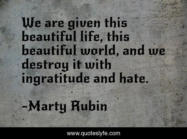 This page presents the quote "We are given this beautiful life, this beautiful world, and we destroy it with ingratitude and hate.". Author of this quote is Marty Rubin. This quote is about ingratitude, life, hate, beauty,.