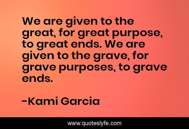 This page presents the quote "We are given to the great, for great purpose, to great ends. We are given to the grave, for grave purposes, to grave ends.". Author of this quote is Kami Garcia. This quote is about great, beautiful-darkness, beautiful-creatures, life, purpose, grave,.