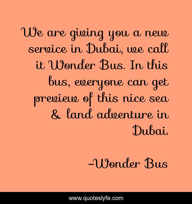This page presents the quote "We are giving you a new service in Dubai, we call it Wonder Bus. In this bus, everyone can get preview of this nice sea & land adventure in Dubai.". Author of this quote is Wonder Bus. This quote is about dubai, bus, toursism, tours, fun, wonder,.