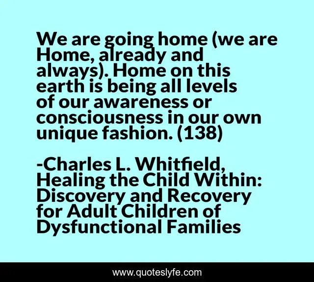 This page presents the quote "We are going home (we are Home, already and always). Home on this earth is being all levels of our awareness or consciousness in our own unique fashion. (138)". Author of this quote is Charles L. Whitfield, Healing the Child Within: Discovery and Recovery for Adult Children of Dysfunctional Families. This quote is about spirituality, healing,.