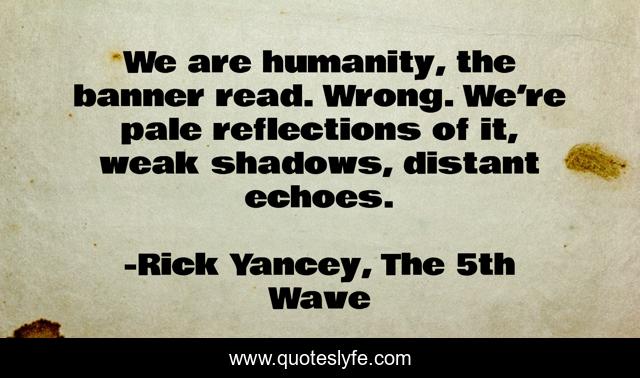 This page presents the quote "We are humanity, the banner read. Wrong. We’re pale reflections of it, weak shadows, distant echoes.". Author of this quote is Rick Yancey, The 5th Wave. This quote is about survival, human-nature, aliens, humanity-and-society, the-5th-wave, humanity-and-reality, humanity,.