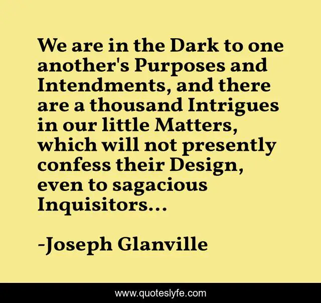 This page presents the quote "We are in the Dark to one another's Purposes and Intendments, and there are a thousand Intrigues in our little Matters, which will not presently confess their Design, even to sagacious Inquisitors...". Author of this quote is Joseph Glanville. This quote is about novel, police, witchcraft, suspense-and-drama, thriller-horror, thriller-novels,.