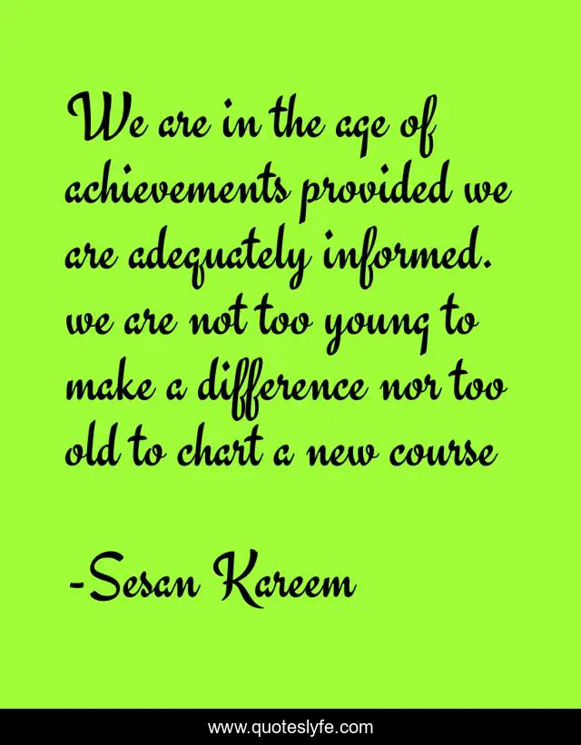 This page presents the quote "We are in the age of achievements provided we are adequately informed. we are not too young to make a difference nor too old to chart a new course". Author of this quote is Sesan Kareem. This quote is about achievement, enthusiasm, inspirational, success,.