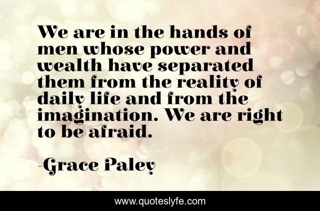 This page presents the quote "We are in the hands of men whose power and wealth have separated them from the reality of daily life and from the imagination. We are right to be afraid.". Author of this quote is Grace Paley. This quote is about peace, united-states, power, war,.