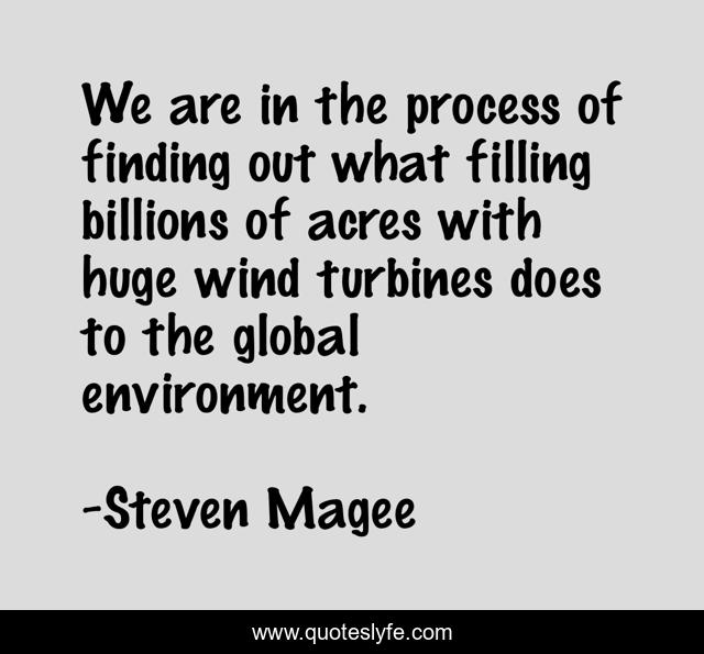 This page presents the quote "We are in the process of finding out what filling billions of acres with huge wind turbines does to the global environment.". Author of this quote is Steven Magee. This quote is about huge, climate, alternate, process, energy, global, turbines, billions, acres,.