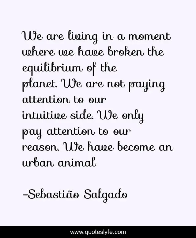 This page presents the quote "We are living in a moment where we have broken the equilibrium of the planet. We are not paying attention to our intuitive side. We only pay attention to our reason. We have become an urban animal". Author of this quote is Sebastião Salgado. This quote is about aesthetics, art, photographer, activism, sebastiao-salgado, activism-inspiration, photography,.