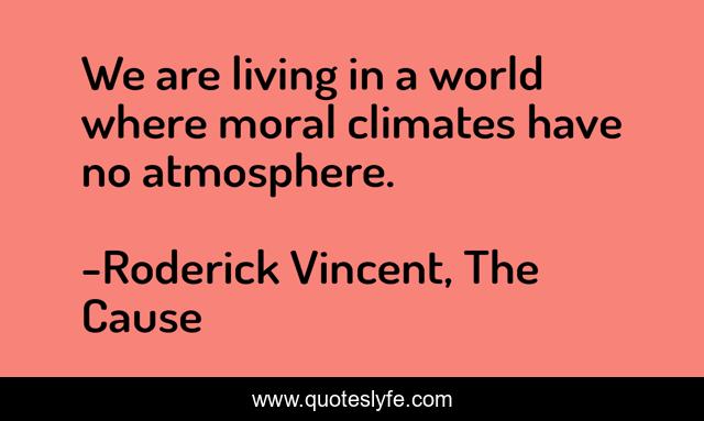 This page presents the quote "We are living in a world where moral climates have no atmosphere.". Author of this quote is Roderick Vincent, The Cause. This quote is about the-cause, morality-life, dystopian-novel, topical, politicians, hassani, politics,.