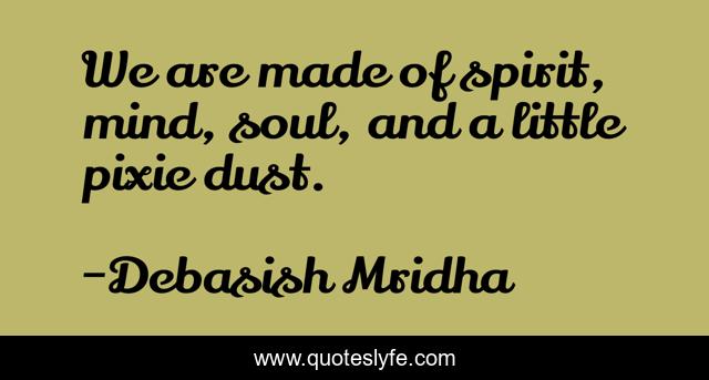 This page presents the quote "We are made of spirit, mind, soul, and a little pixie dust.". Author of this quote is Debasish Mridha. This quote is about what-are-we-made-of, debasish-mridha, philosophy, mind, soul, debasish-mridha-m-d, pixie-dust, quotes, inspirational,.