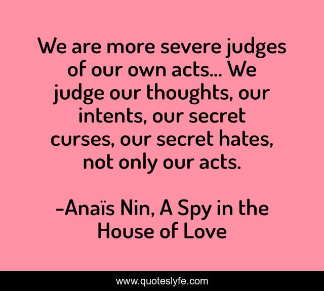 This page presents the quote "We are more severe judges of our own acts... We judge our thoughts, our intents, our secret curses, our secret hates, not only our acts.". Author of this quote is Anaïs Nin, A Spy in the House of Love. This quote is about life, reflection, self, acts, actions, judgement, severe, truth, thoughts,.