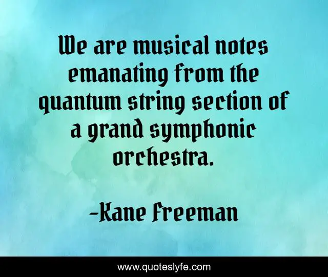 This page presents the quote "We are musical notes emanating from the quantum string section of a grand symphonic orchestra.". Author of this quote is Kane Freeman. This quote is about life, quantum-physics, space, god, philosophy, music, universe, existence,.