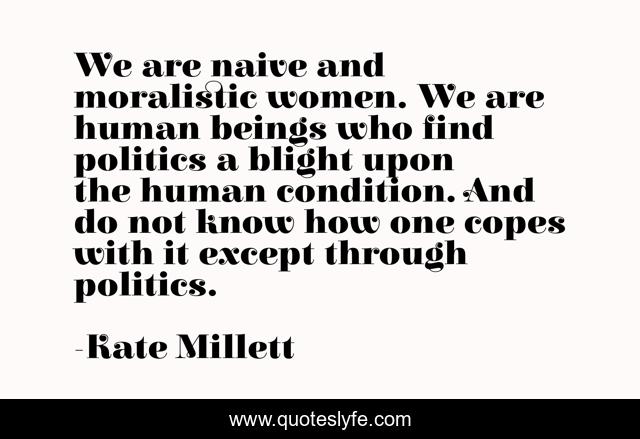 This page presents the quote "We are naive and moralistic women. We are human beings who find politics a blight upon the human condition. And do not know how one copes with it except through politics.". Author of this quote is Kate Millett. This quote is about human, women,.