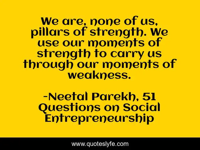 This page presents the quote "We are, none of us, pillars of strength. We use our moments of strength to carry us through our moments of weakness.". Author of this quote is Neetal Parekh, 51 Questions on Social Entrepreneurship. This quote is about weakness, strength, inspirational, enthusiasm,.