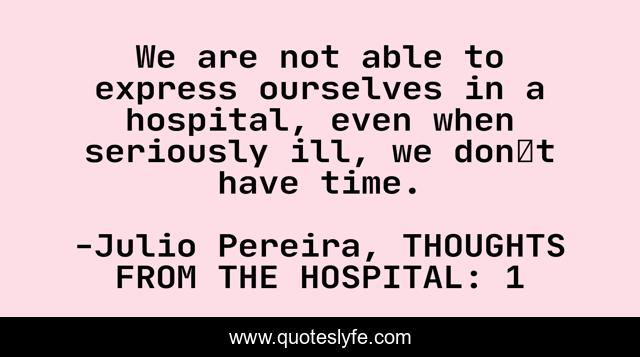 This page presents the quote "We are not able to express ourselves in a hospital, even when seriously ill, we don�t have time.". Author of this quote is Julio Pereira, THOUGHTS FROM THE HOSPITAL: 1. This quote is about medicine, hospital, doctor-medlife,.