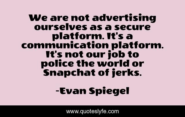 This page presents the quote "We are not advertising ourselves as a secure platform. It's a communication platform. It's not our job to police the world or Snapchat of jerks.". Author of this quote is Evan Spiegel. This quote is about world, job, advertising,.
