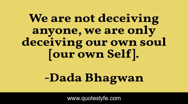 This page presents the quote "We are not deceiving anyone, we are only deceiving our own soul [our own Self].". Author of this quote is Dada Bhagwan. This quote is about spiritual, deceiving, soul,.