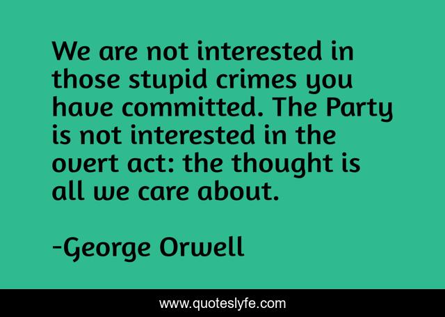 This page presents the quote "We are not interested in those stupid crimes you have committed. The Party is not interested in the overt act: the thought is all we care about.". Author of this quote is George Orwell. .