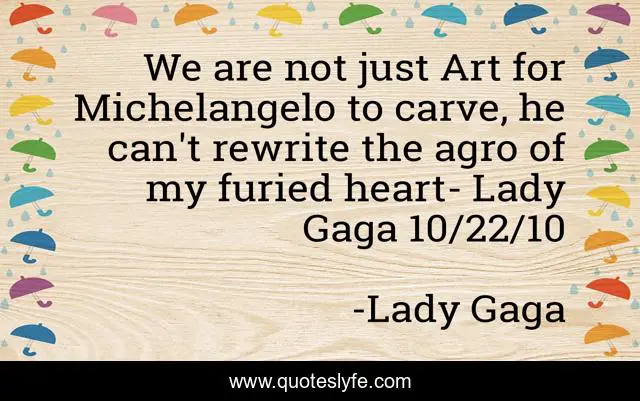 This page presents the quote "We are not just Art for Michelangelo to carve, he can't rewrite the agro of my furied heart- Lady Gaga 10/22/10". Author of this quote is Lady Gaga. This quote is about lady-gaga, musician, music, pop, song-lyrics,.