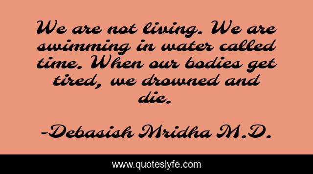 This page presents the quote "We are not living. We are swimming in water called time. When our bodies get tired, we drowned and die.". Author of this quote is Debasish Mridha M.D.. This quote is about living, life, passage-of-time, inspirational, philosophy, debasish-mridha, quotes, bodies-get-tired, time,.