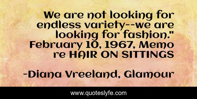 This page presents the quote "We are not looking for endless variety--we are looking for fashion." February 10, 1967, Memo re HAIR ON SITTINGS". Author of this quote is Diana Vreeland, Glamour. This quote is about fashion, vreeland, variety,.