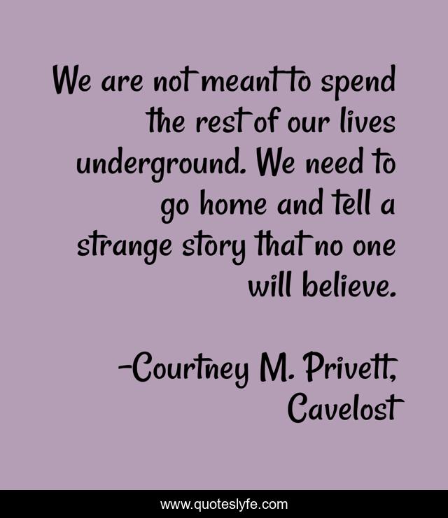 This page presents the quote "We are not meant to spend the rest of our lives underground. We need to go home and tell a strange story that no one will believe.". Author of this quote is Courtney M. Privett, Cavelost. This quote is about life, lost, cave, story, strange, underground,.