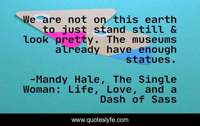 This page presents the quote "We are not on this earth to just stand still & look pretty. The museums already have enough statues.". Author of this quote is Mandy Hale, The Single Woman: Life, Love, and a Dash of Sass. This quote is about life, statues, destiny, greater-calling, helping-people, making-a-difference, purpose-of-life, positive-thinking, museums,.