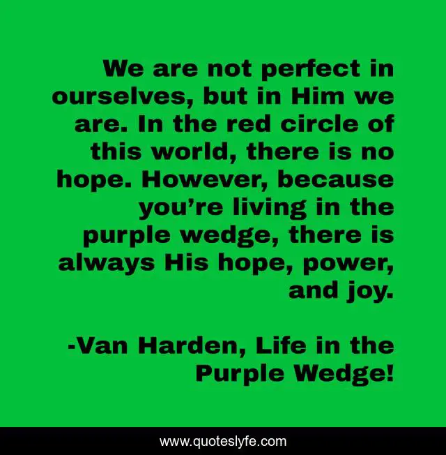 This page presents the quote "We are not perfect in ourselves, but in Him we are. In the red circle of this world, there is no hope. However, because you’re living in the purple wedge, there is always His hope, power, and joy.". Author of this quote is Van Harden, Life in the Purple Wedge!. This quote is about jesus-christ, faith, power, joy, perfection, hope,.